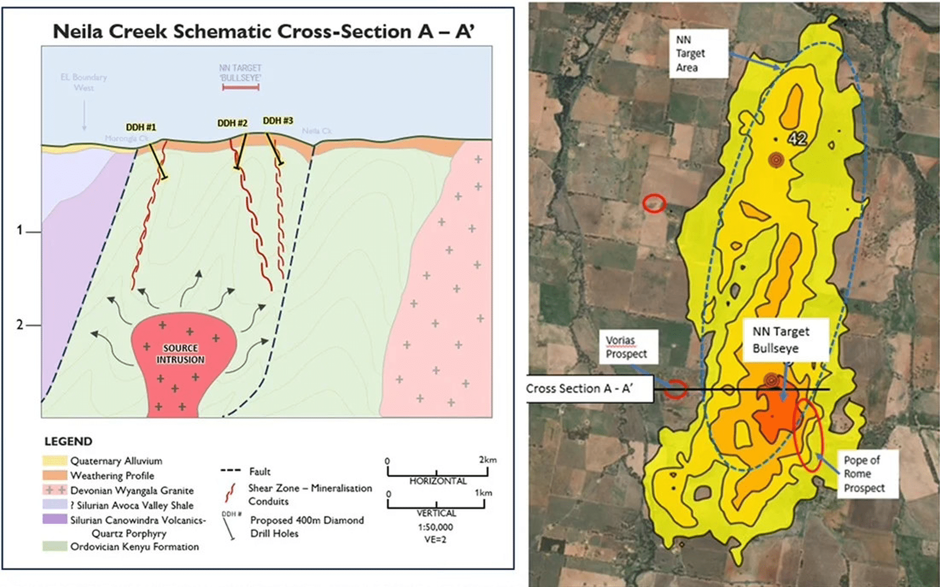 The proposed initial exploration at Neila Creek is planned to begin early in the 2025 reporting period and will consist of three diamond core holes (#1 to #3 in figure below) to approximately 400m depth for 1,200m total. A budget of approximately $400,000 is allocated for the first phase of exploration drilling. Depending on results, further work including follow-up drilling, geophysics and geochemical sampling will be considered for areas both within the initial AoI, and to the north in yet to be investigated areas.