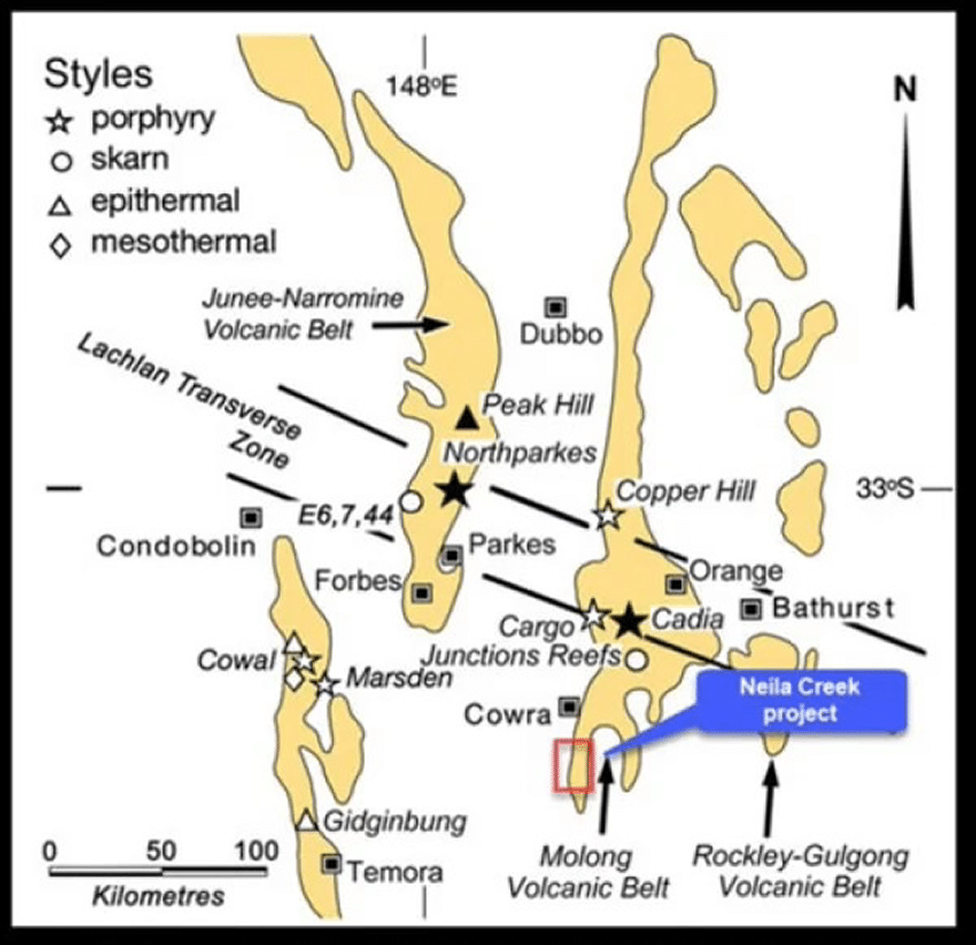 The Neila Creek tenement (EL8864) is an early-stage exploration prospect. However, its location in a recognised volcanic belt hosting large scale, world class mineralised systems offers a special opportunity. Three main historic prospects are located on the tenement and are of a structurally controlled copper – gold nature.