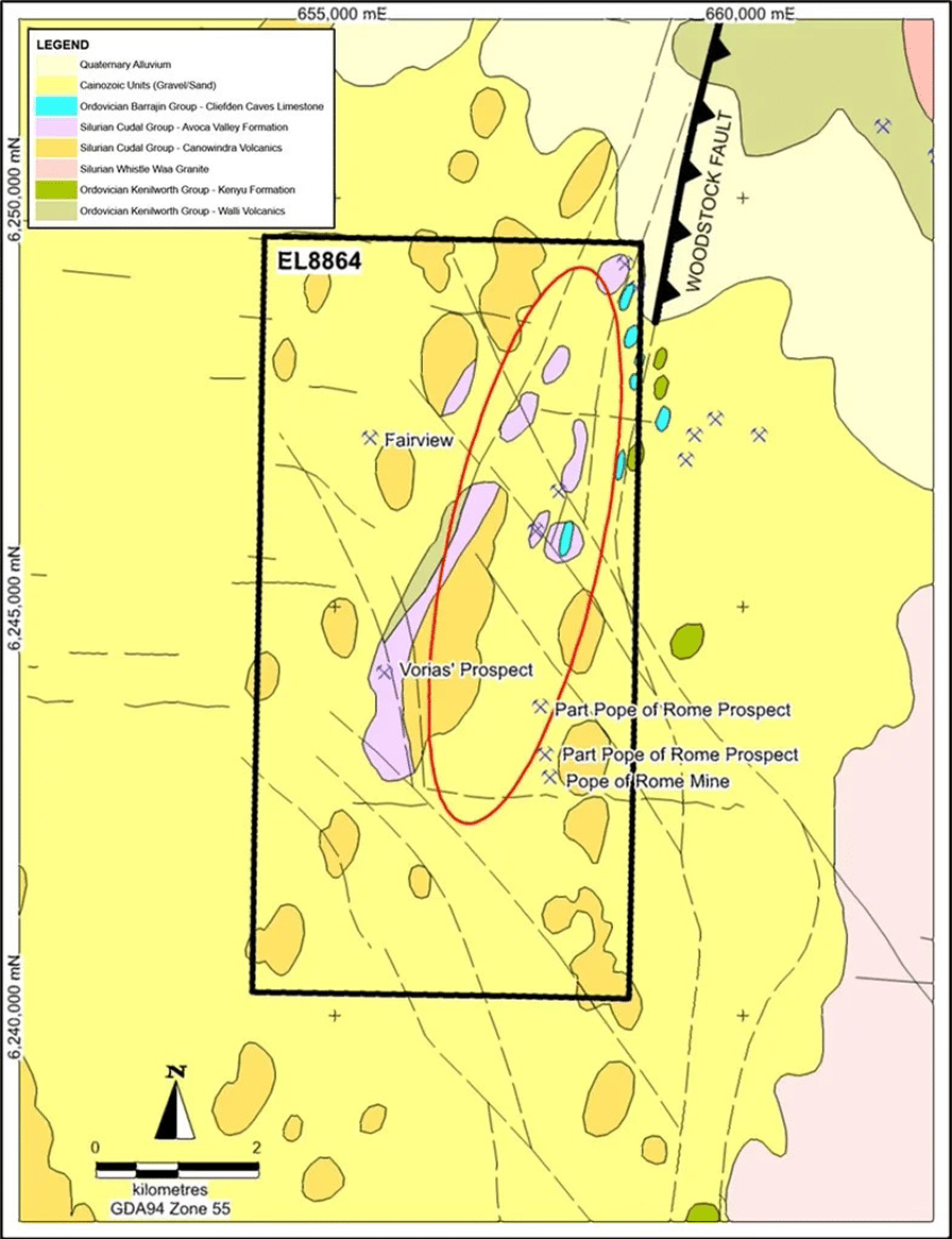 The tenement lies on the structurally complex western margin of the Ordovician Molong Volcanic Belt and the Silurian Cowra Trough. Volcanics and volcaniclastic sediments of the Silurian Cudal Group comprise the majority of the tenement area, with limited outcrop of Ordovician units.